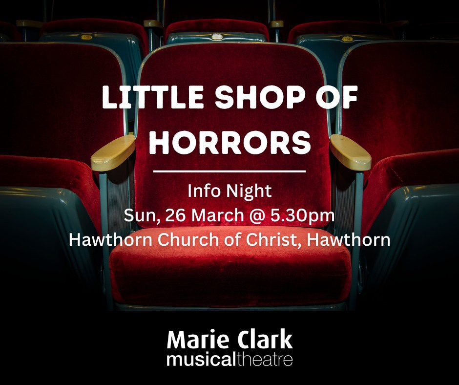 Hawthorn Church of Christ 42 Angus Rd, Hawthorn, SA, AustraliaFolks! If you're interested in joining our November production of LITTLE SHOP OF HORRORS, then come along to our info night for the show on Sunday, March 26th! Hear directly from our Production Team on what they're most looking forward to about staging this much loved horror comedy rock musical, and learn what'll be involved […]
