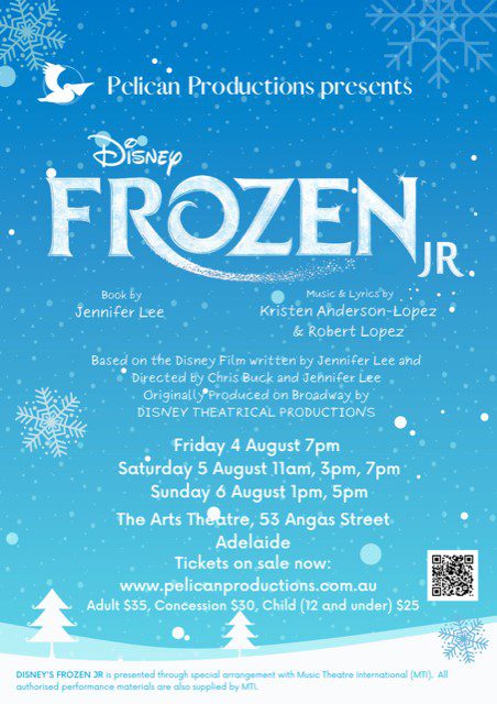 Prepare to enter the magical kingdom of Arendelle, in Frozen Jr, a captivating musical adaptation of the Disney film. Follow the epic adventure of Anna and Elsa as they discover the true meaning of love, loyalty and the power of sisterhood. Featuring beloved musical numbers, stunning costumes and iconic characters, Frozen Jr will captivate audiences and warm their hearts with this endearing tale. There will be six, 1-hour performances of Frozen Jr from Friday 4 August – Sunday 6 August 2023, directed by Georgia Broomhall, music direction by Ben Francis and choreography by Maddie Lochert and Tayla Prime.