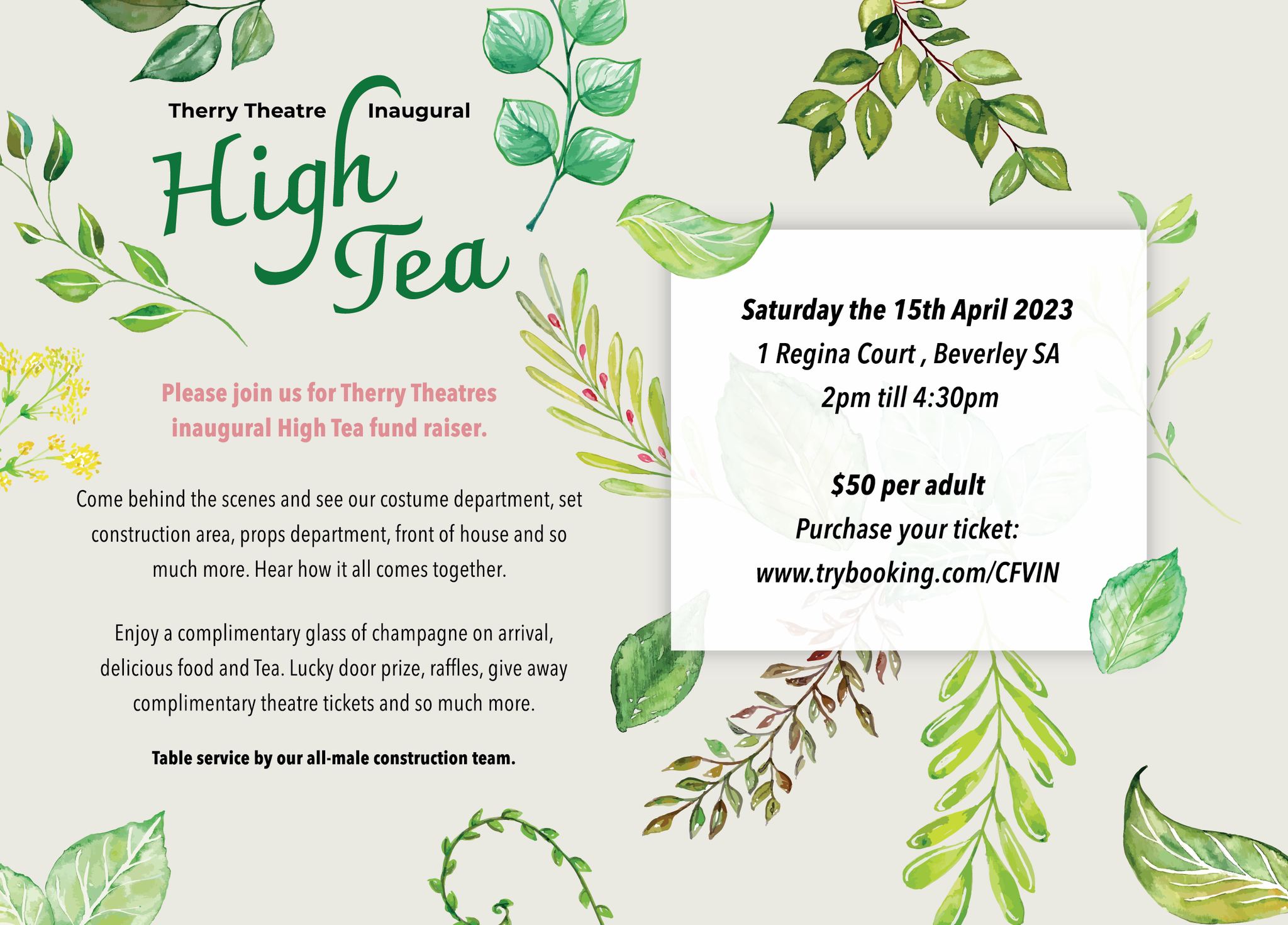 Therry is holding a High Tea fundraising event – Behind The Scenes. Why is it different? This function is being organised and hosted by Therry’s (all-male) set construction team. It’s being held at Therry’s Beverley clubrooms on Saturday,15 April from 2-4pm. In addition to tasty savoury and sweet morsels, real brewed tea – or coffee if you insist – it’s a rare opportunity to come behind the scenes and see where and how shows are created. Hear from our people about their involvement in set design and construction, creating costumes, working front of house, ticketing and more.