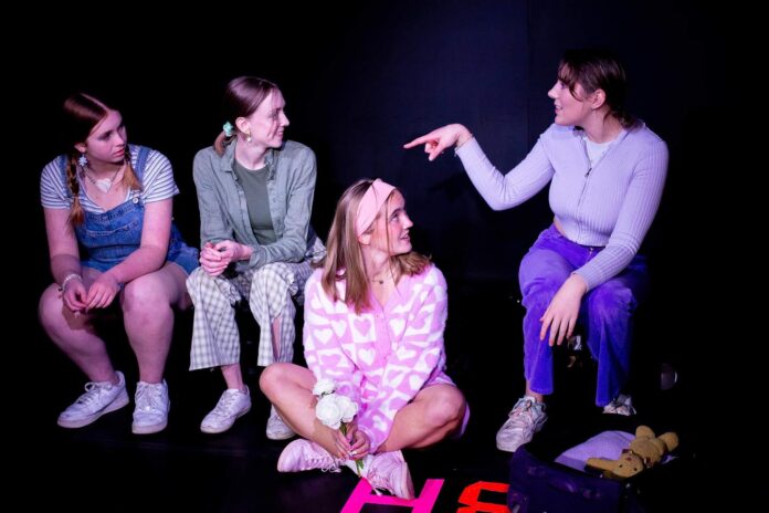 Who are these four young women on stage and, indeed, where are they? They appear to share common friendship bonds yet they can be mean to each other too. Katie (Lizzie Zeuner) leads the pack. She already has a life threatening bullet lodged near her spine and she appears to know what, as a collective, they should do in order to break the nexus of their predicament. She also leads the chiding (bullying?) of late arrival Darcy (Jasmyn Setchell). Darcy may well be timid and frightened for we learn she has been disfigured in an acid attack. She and the other two girls Mia (Mia Ellis) and Grace (Ashlynn Bunt) look to the forceful Katie to orchestrate their next move. There is much talk of death and funerals and grief. It appears to be an obsession. They agree that “You should be able to grieve in the way you choose” and “When you grieve nobody blames you”. A rather odd yet telling comment?