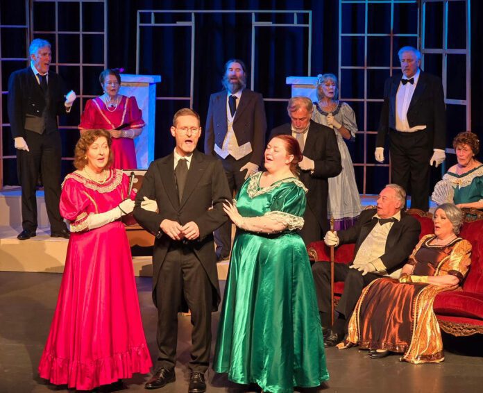 Set in Vienna in the 1820’s, the production demands stylized manners, costuming, scenery, and stage properties to suit the period, even though the dialogue evokes the wit and humour of the early nineteen hundreds when the show was written. To make the show look visually authentic costs a lot of money, and SALOS have made a good fist of it even though there are a number of anachronistic elements, such as modern bowtie, dinner suit and shoes, modern ladies hats, Stelvin closure wine bottles (invented in 1964!), and a very modern solo dance in quite modern attire, but this is a small complaint. The ladies’ costumes were lavish and beautifully made, and they were worn with aplomb and bearing. Some of the men’s costumes were similarly visually appealing.