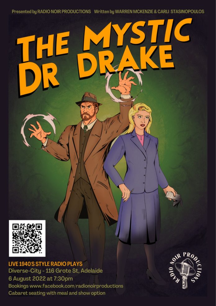 The overall title, The Mystic Dr Drake, hints at the underlying otherworldliness of some aspects of the scripts. This Dr Drake is indeed mystic. Stuart Pearce played Drake with skill and style. Mostly the straight-man, the character occasionally dipped into the supernatural which was at times amusing and at others, chilling. As with all of the performers, Pearce mastered the old-style radio plays’ genre and form. And, along with the others, he kept us interested and entertained while essentially standing at the upright microphone, and delivering his lines with energy and critical timing.